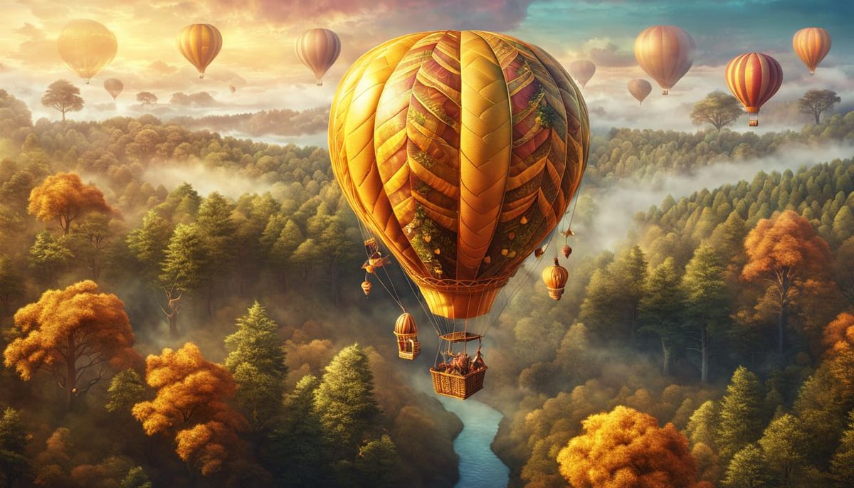 A vibrant concept art illustration of a hot air balloon hovering above a woodland creature. Features a misty atmosphere, warm lighting, and swirling patterns in a fantasy style.