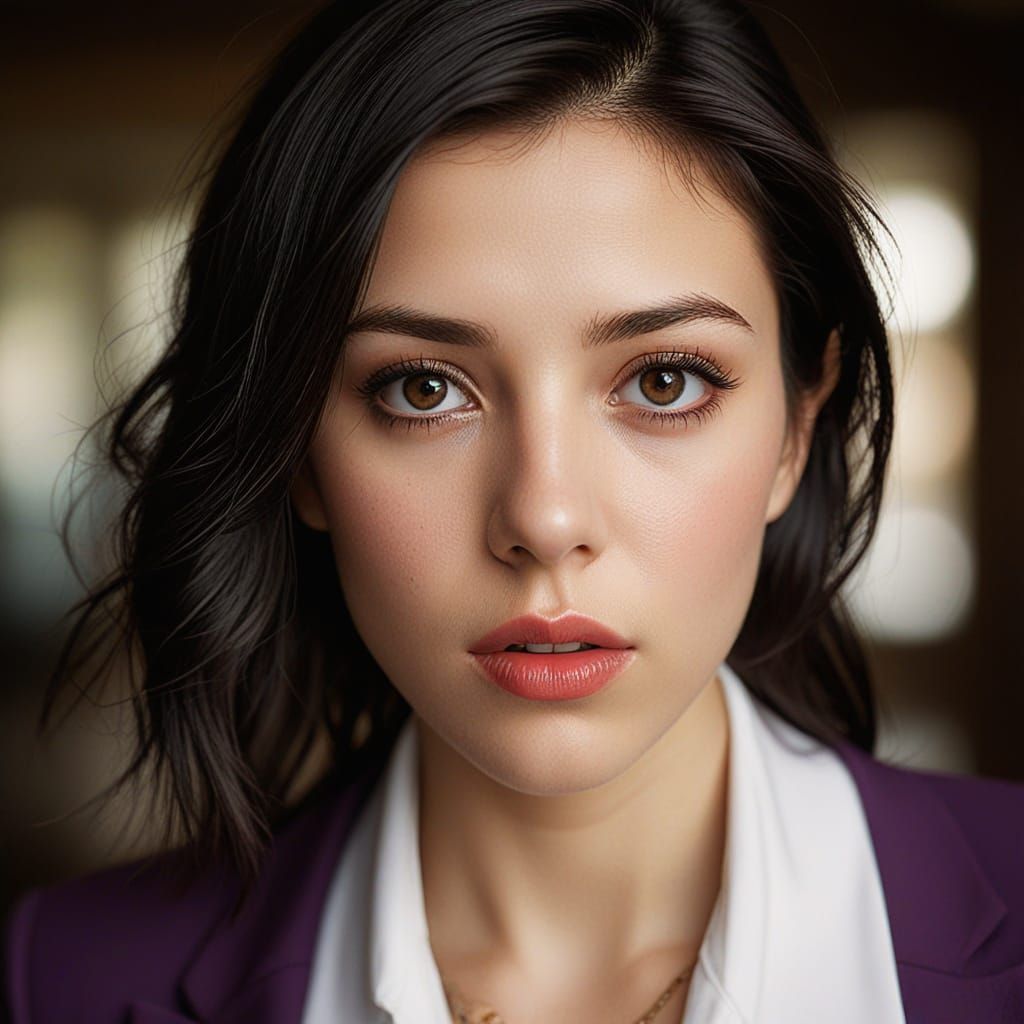 This stunning portrait captures a young woman with striking red eyes and black hair, set against a subtle, natural lighting background with a warm sepia tone. The intricate details on her lifelike face and tailored uniform are rendered in ultra-sharp focus, showcasing a flawless, cinematic photography st...