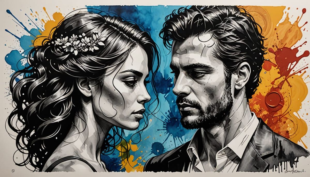 em uma tela branca, no estilo de mídia mista do artista gráfico (((Danny O'Connor))) compõe uma imagem de um velho boêmio casado, casal que ...