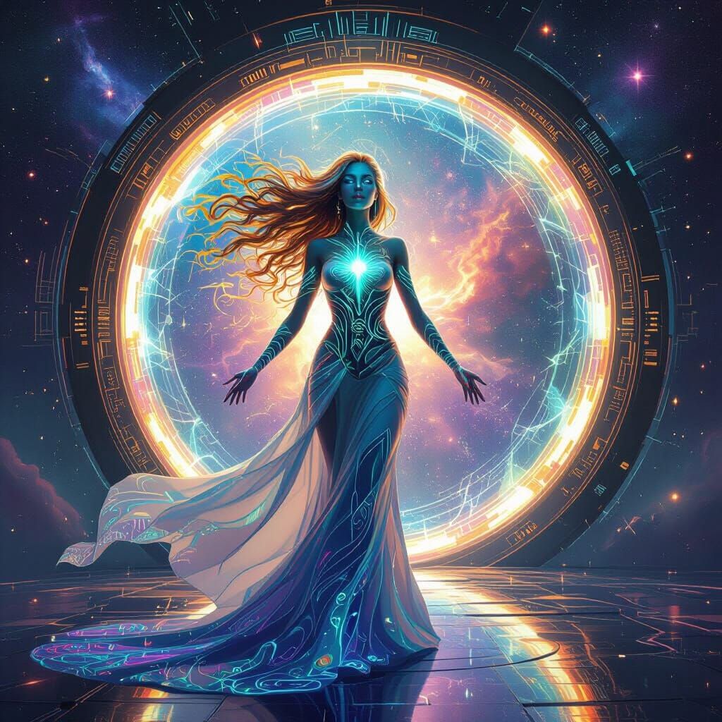 This image shows a spectral woman with flowing hair standing before a shimmering portal. The artwork blends visionary, biomechanical, and futuristic elements with vibrant contrasts and ethereal light.
