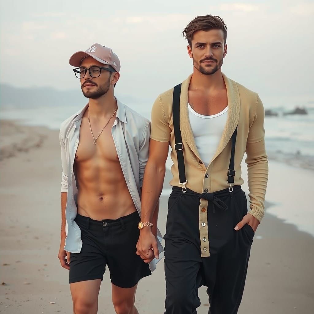 This image shows two men walking hand in hand on a beach as the sun rises. The photorealistic image features cinematic lighting and great attention to detail, evoking a sense of warmth and realism.