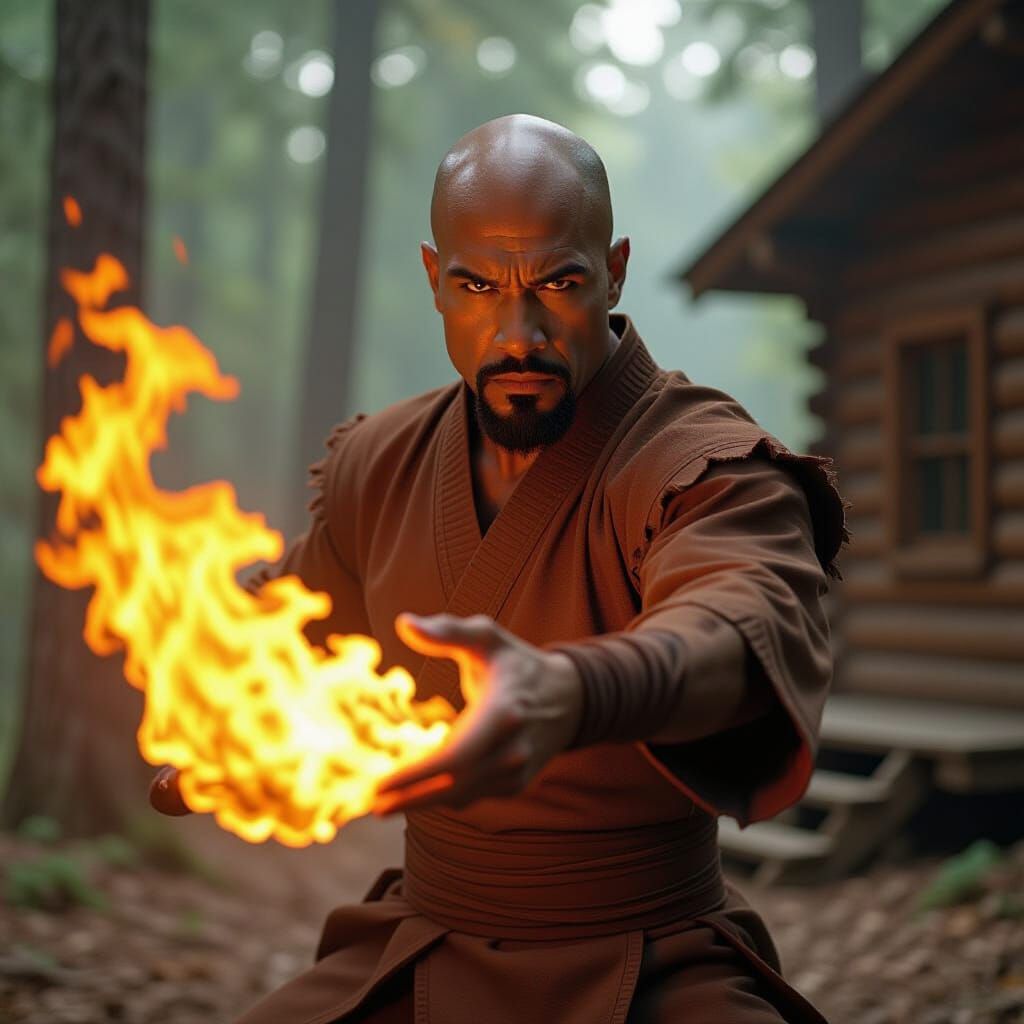 This image shows a 61-year-old dark-skinned Black man firebending powerfully in a dramatic, cinematic style. He wears a torn brown outfit and stands in a fighting stance outside a woodland cabin.