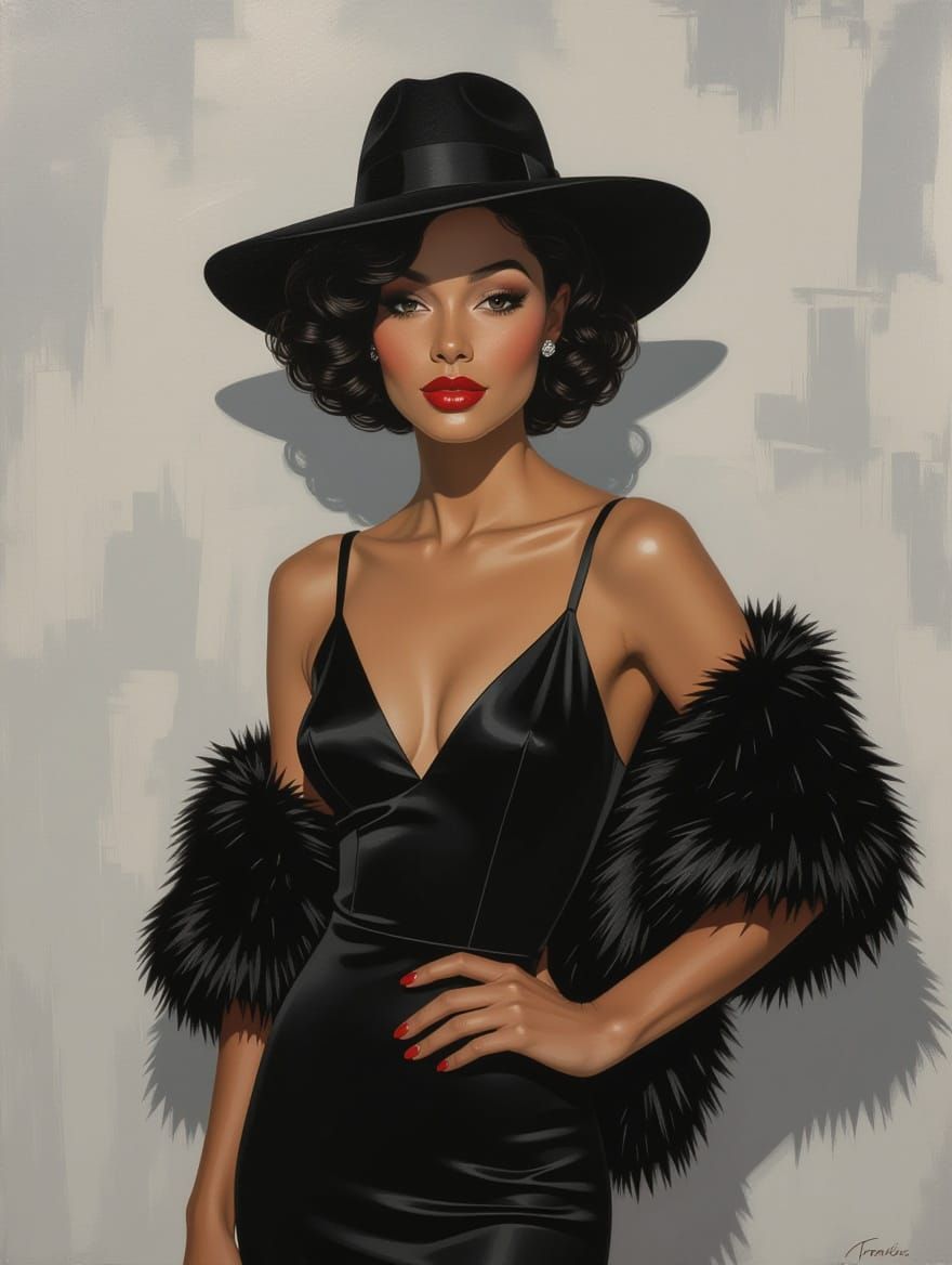 A monochrome portrait of an African American woman in Art Deco style, wearing a fedora and fur bolero. The image evokes geometric elegance and expressive linework.