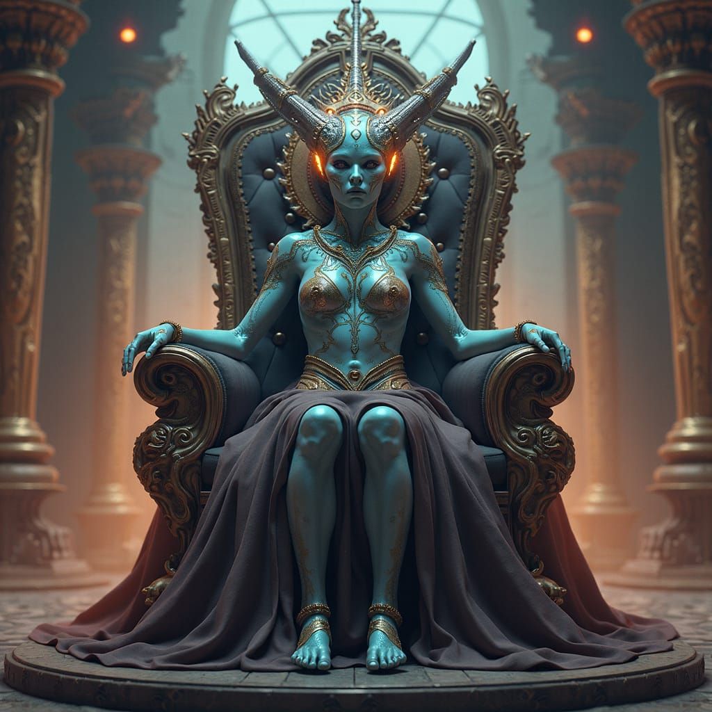 A digital matte painting of an alien queen on her throne. The scene is rich with strange symbols, advanced technology, and deep, fantastical colors, rendered as trending fantasy concept art.