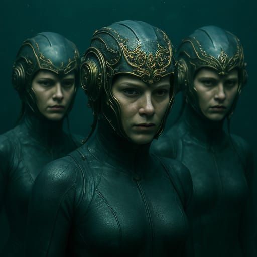 This image shows three women wearing dark helmets with metallic masks, submerged in a deep green aquatic environment. The artwork has a cyberpunk aesthetic with industrial, high-tech, steampunk-inspired elements.