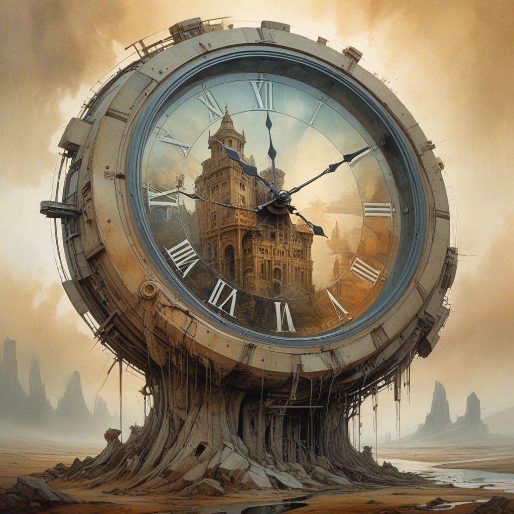 This image shows a captivating watercolor abstract painting of a sentinel in a daunting dreamscape, set against a backdrop of a double exposure clock.