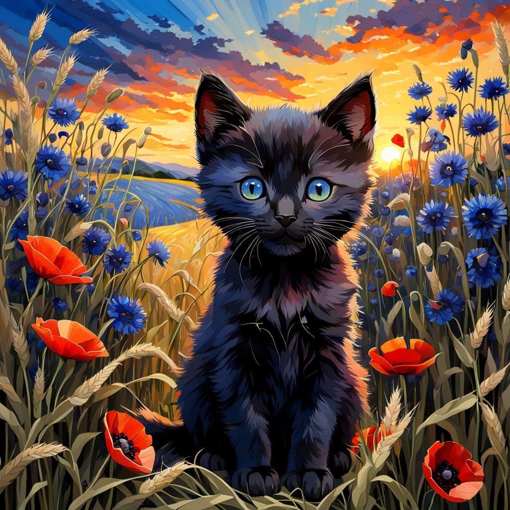 A striking picture of a black kitten sitting in a colorful field of wheat, cornflowers, and poppies. The sunset sky and overall composition are reminiscent of Gustav Klimt's painting style.