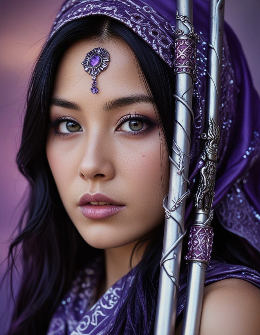 A striking portrait of an exotic Japanese warrior princess with deep purple hair, silver arm tattoos, and a glowing staff. She wears violet silk scarves against a purple aurora night sky.