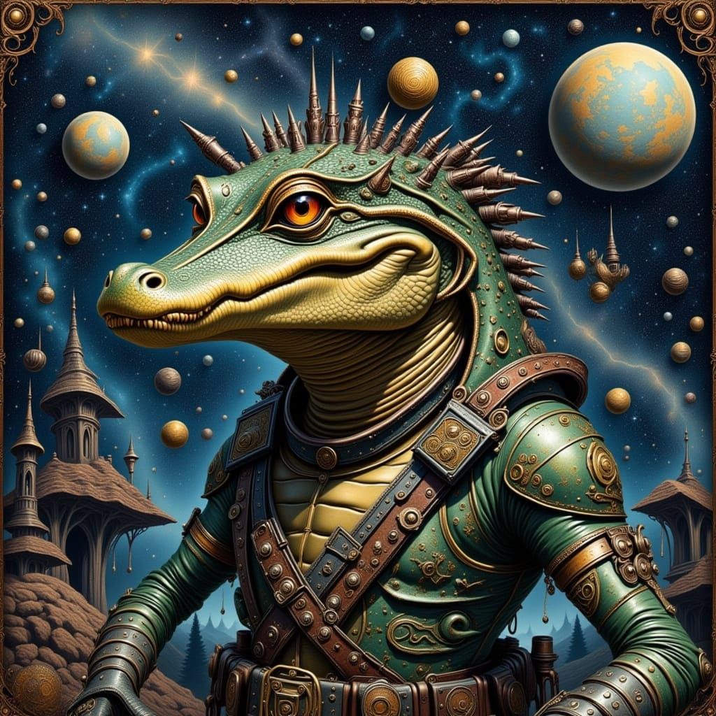 This image features a steampunk-themed anthropomorphic alligator adventurer exploring the cosmos. The artwork blends retro-futuristic design with a unique, otherworldly aesthetic.