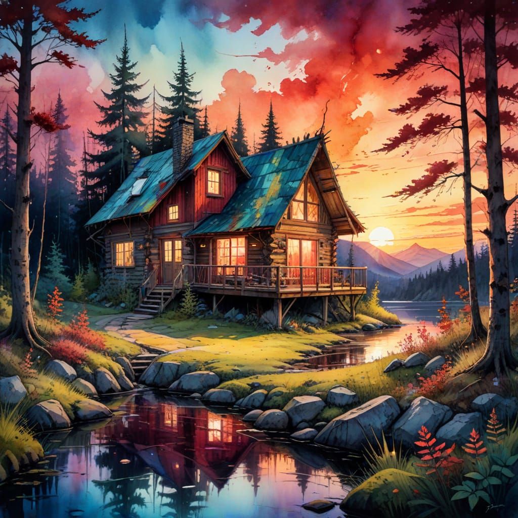 This image showcases a beautifully rendered digital watercolour illustration of a cozy cabin in the woods at sunset. Executed in a stylized watercolour style with intricate contrast and HDR effects, the scene features vibrant colours and intricate details, all set against a stunning red alcohol ink palet...