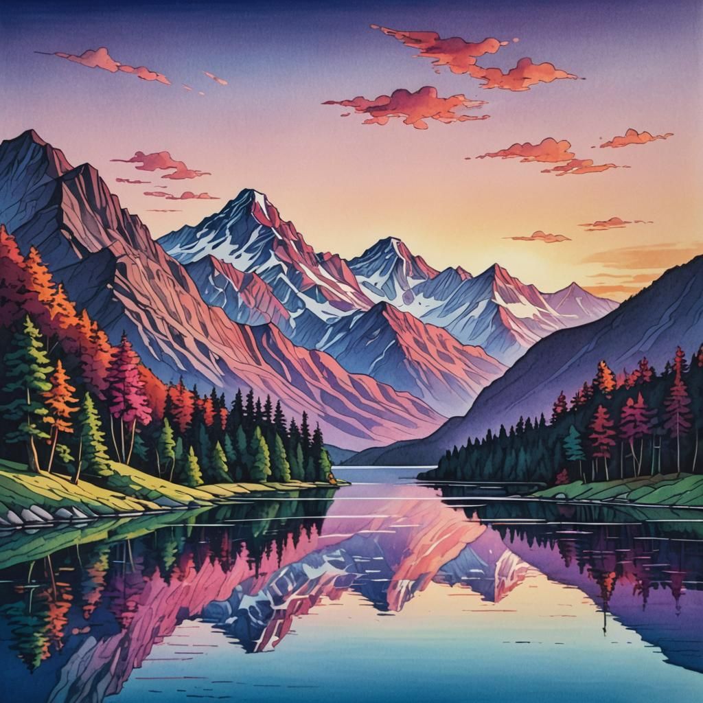 This image features a serene mountain lake at dawn, captured in a three-dimensional marker drawing style with saturated colors and strong contrast.