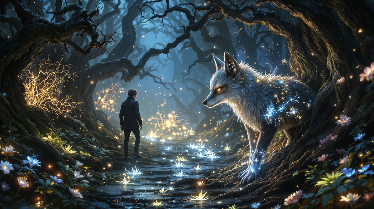 This enchanting image shows a mystical creature with soft, internal light guiding a figure through an ancient, magical woodland. Glowing flora and luminous pathways illuminate the mystical atmosphere.