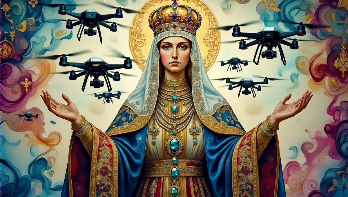 A digital icon of Olga of Kyiv in bejeweled robes, encircled by drones. The artwork blends traditional religious iconography with swirling alcohol ink patterns and a futuristic, dreamlike aesthetic.