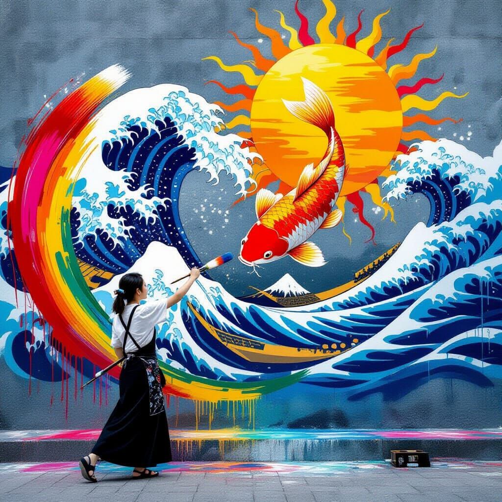 This image shows a dynamic scene of a Japanese street artist creating a colorful mural of a koi fish and waves on a brick wall. The art style is cinematic and ultra-realistic, with bold colors and energetic movement.