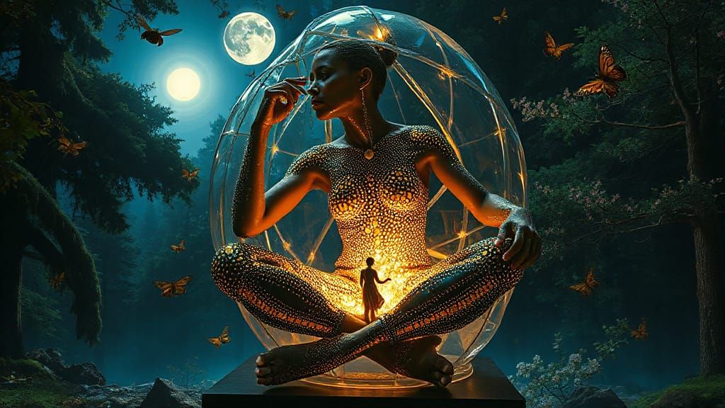 This image depicts a 1970s female sculptor within her massive abstract creation. The surreal bio-art collage features mystical elements, vibrant colors, and symbolic imagery of transformation.