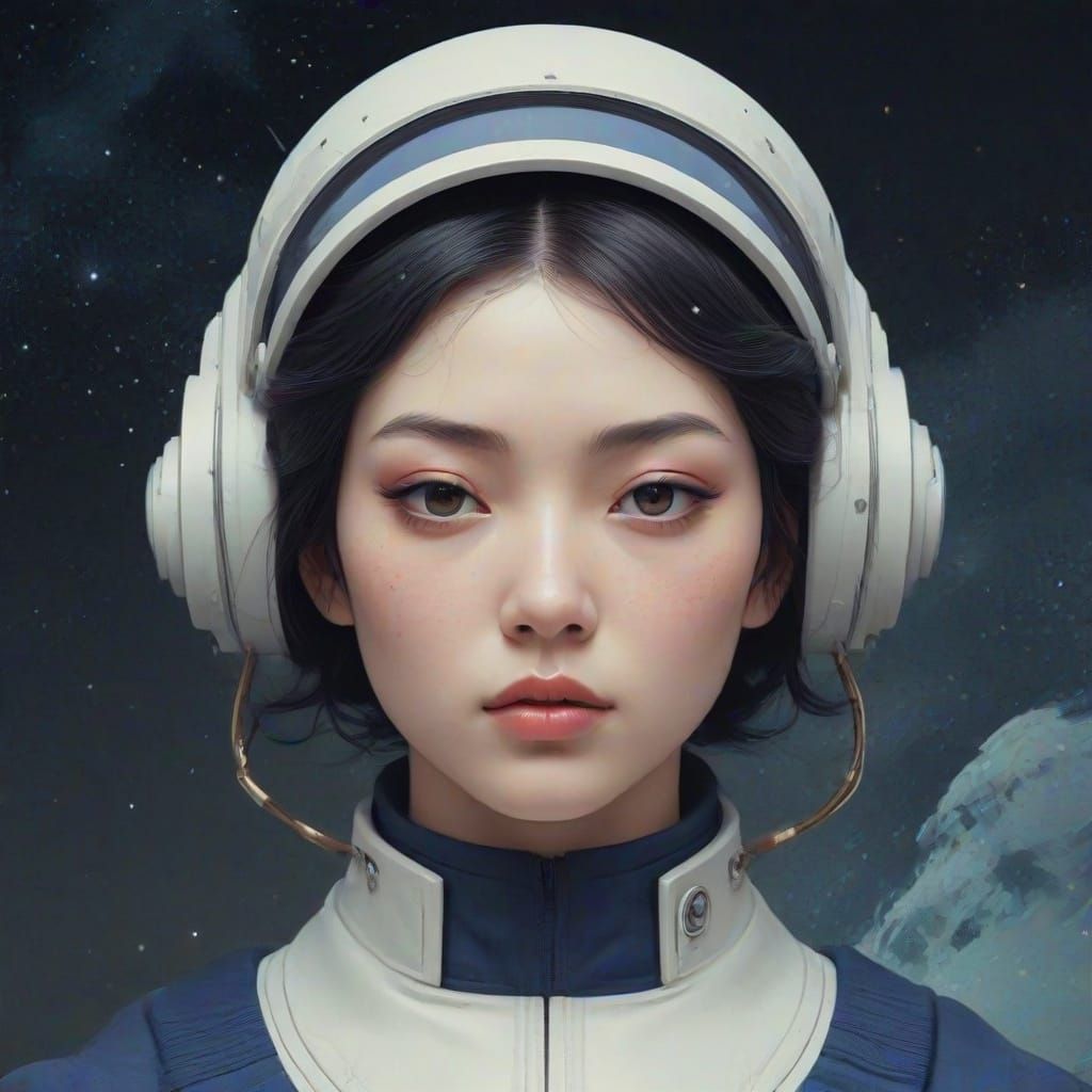 A striking picture of a vintage sci-fi galaxy girl portrait. The artwork has brush and ink elements in a high concept art style.