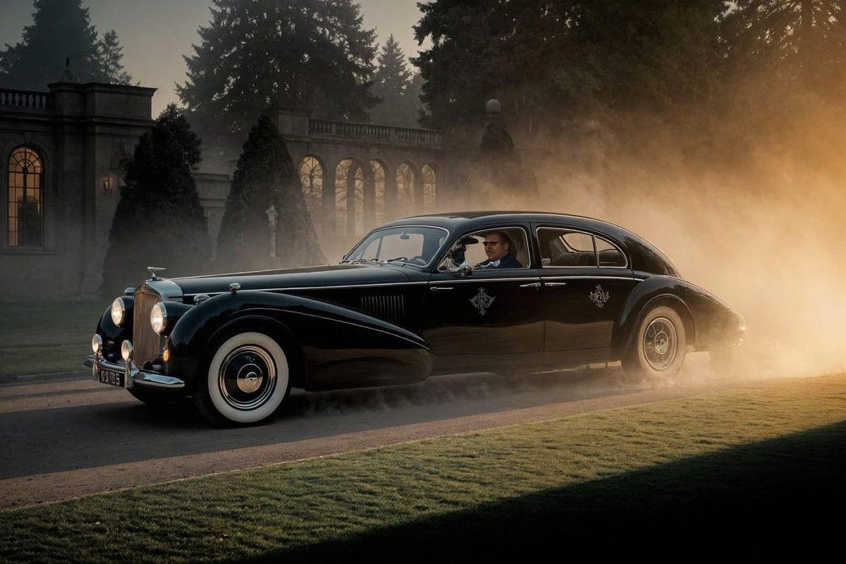 This image depicts a classic 1950 Bentley Galibier Saloon with a smartly dressed chauffeur behind the wheel, suggesting luxury and elegance of a bygone era.