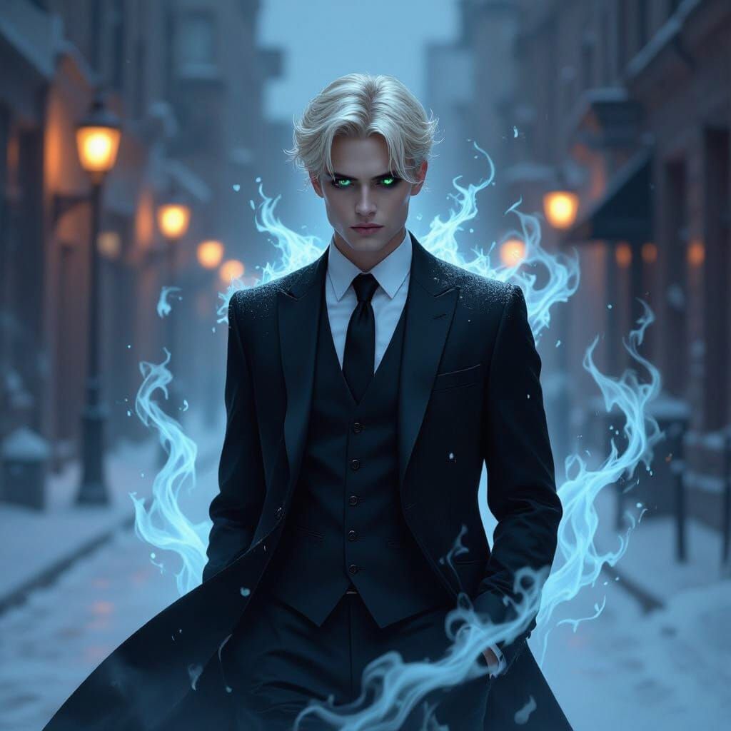 This image shows a fair-haired, young male shadow sorcerer in a black suit on a dimly lit street. Shadows swirl around him as frost emanates from his footsteps in an eerie, digital art style.