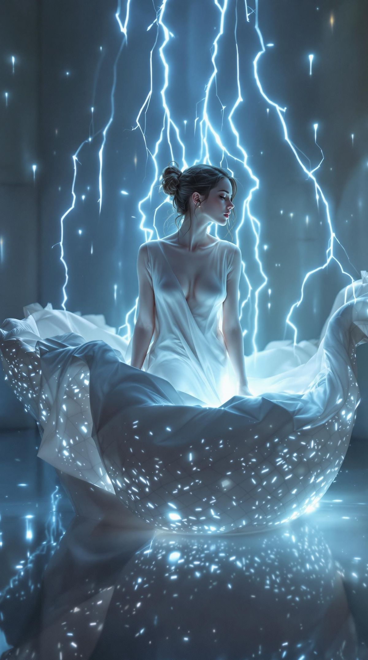 This image depicts a woman in a serene, ethereal environment, surrounded by a luminous glow, with a focus on her delicate, translucent body. The scene features a reflective, dragon-shaped bath, evoking a sense of calm and wonder.