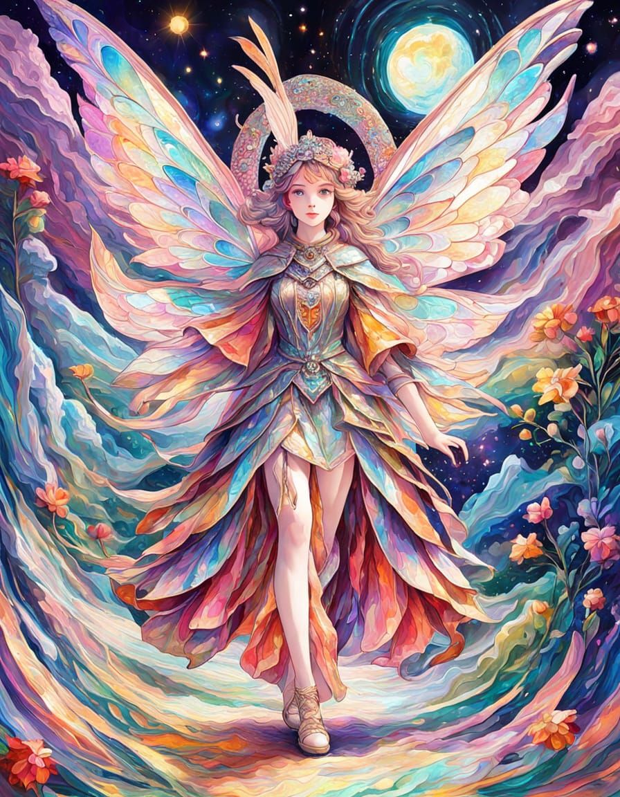 This enchanting image showcases a fairy in a colorful, floral-patterned robe, amidst the ruins of an ancient civilization. The anime-style illustration features vibrant, hard-edged ink colors, shimmering gloss effects, and thick brushstrokes, creating a mystical and cosmic atmosphere.