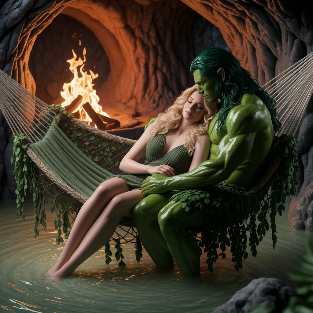 This enchanting scene depicts a serene underwater cave, illuminated by warm firelight, where a blonde woman rests in a hammock, surrounded by a green-skinned companion, in a lush, mystical environment