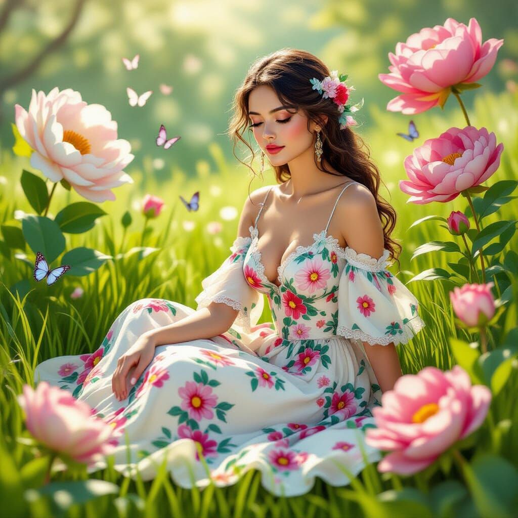 This image shows a woman with floral patterns on her dress, sitting on grass with vibrant flowers and butterflies. Rendered in a detailed, whimsical illustrative style with soft lighting.