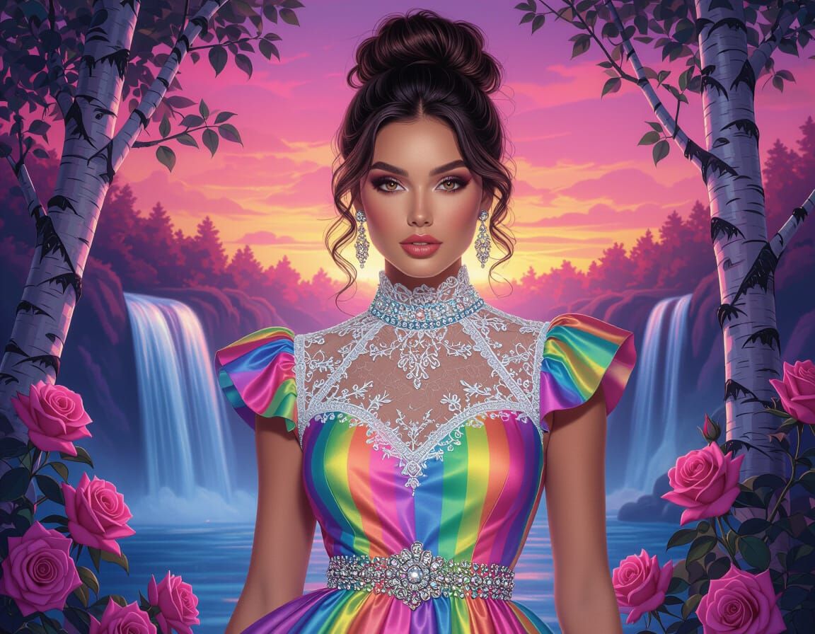 A woman with vibrant neon rainbow hair and striking makeup poses by a waterfall at sunset. She wears an elegant satin gown adorned with lace and rhinestones. Rendered in a detailed airbrush style with soft gradients.