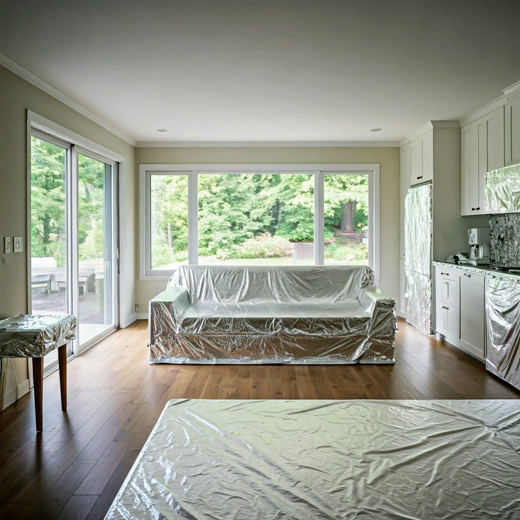 This image shows a unique, futuristic take on domestic living, where a modern house's interior is covered in shiny foil, creating a striking contrast between the sleek, metallic surfaces and the warm, inviting spaces within.