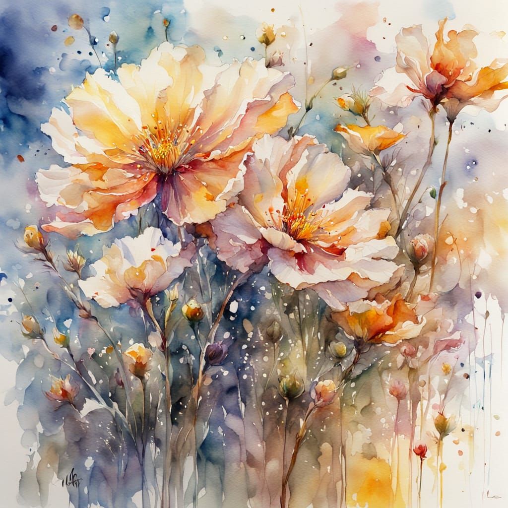 A watercolor painting of a blooming garden reaching for the sky. The close-up shot features delicate, shimmering petals, soft brushstrokes, and vibrant colors under warm, golden lighting.