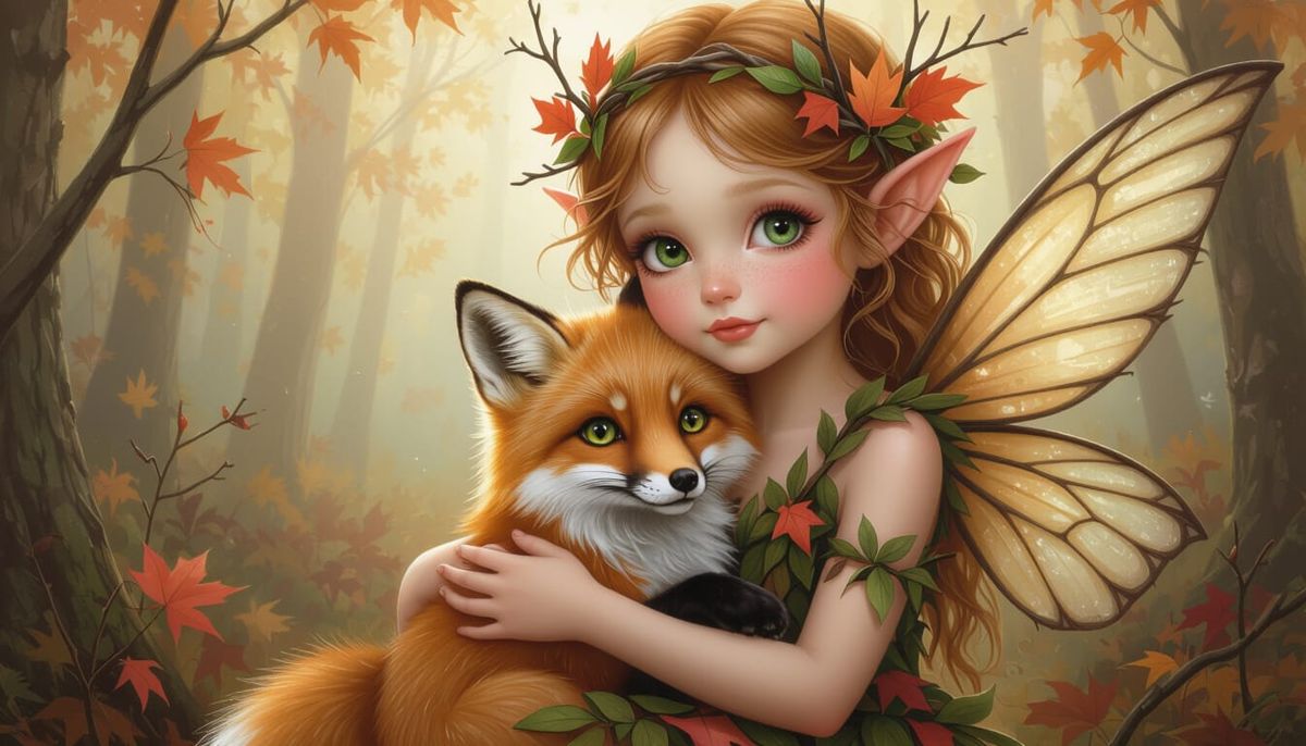 This image shows a fair-skinned fairy with green eyes cradling a red fox in an autumn forest. The artwork blends realism and fantasy with meticulous textures and soft lighting.