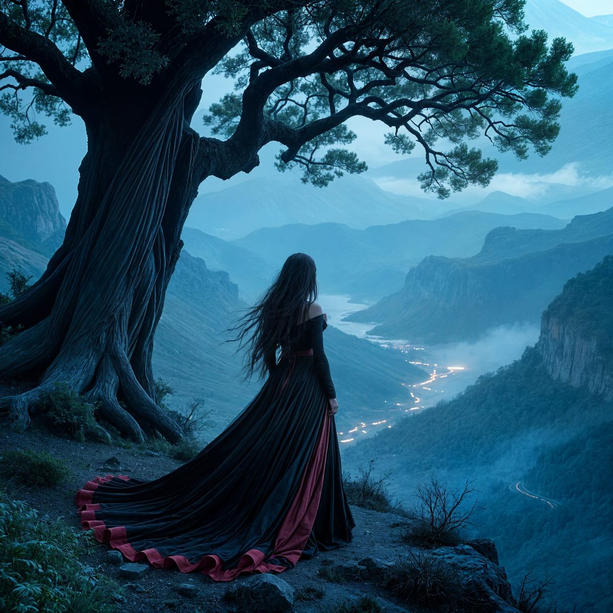 This image shows a woman with long black hair and a flowing red and black dress standing on a cliff, overlooking a valley with a blue glow in the distance. The aesthetic is cinematic, atmospheric and dramatic.