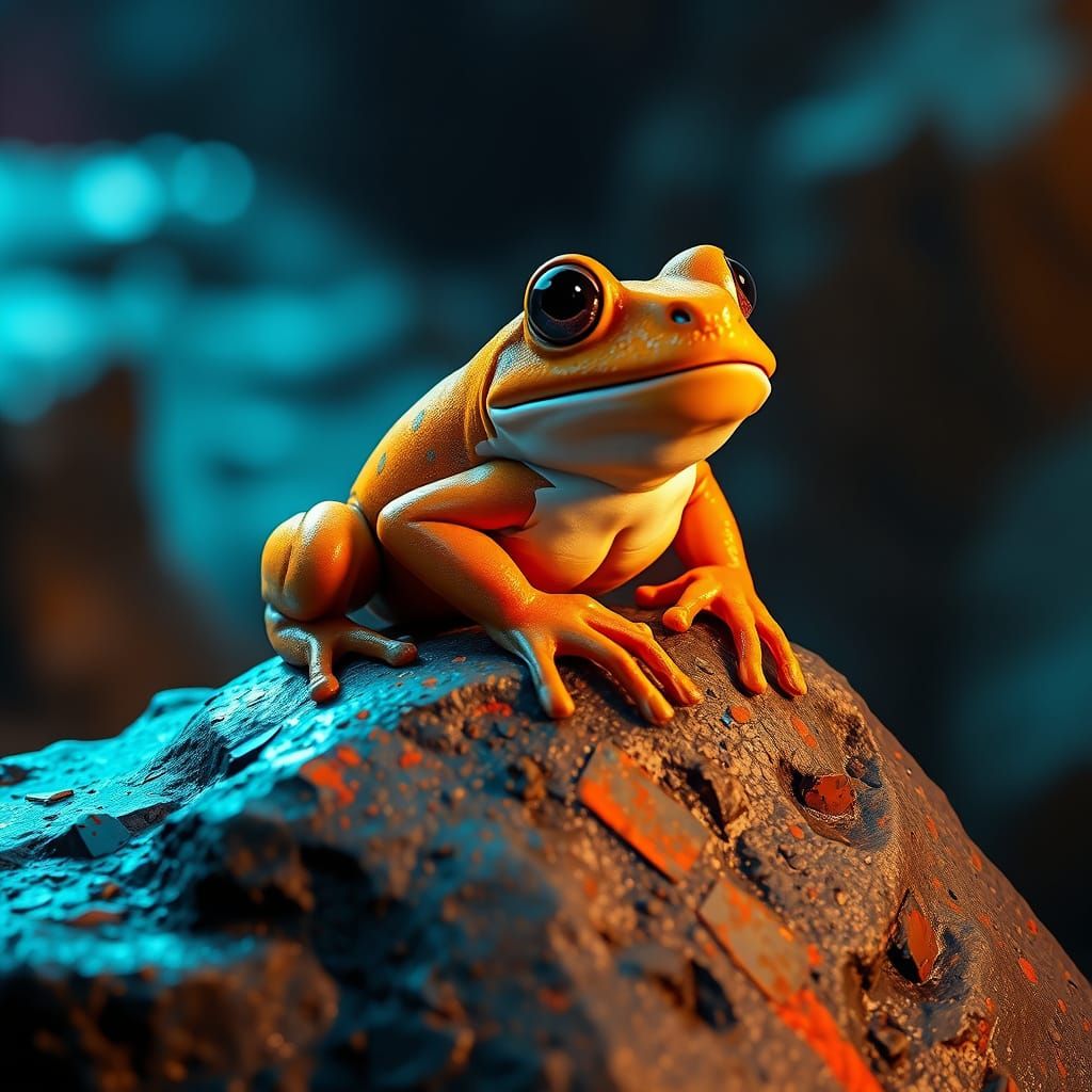 This image is a vibrant concept art piece featuring a cute frog sitting on a slick rock, set against a triadic color palette with dynamic lighting and intricate details, reminiscent of Alphonse Mucha's Art Nouveau style