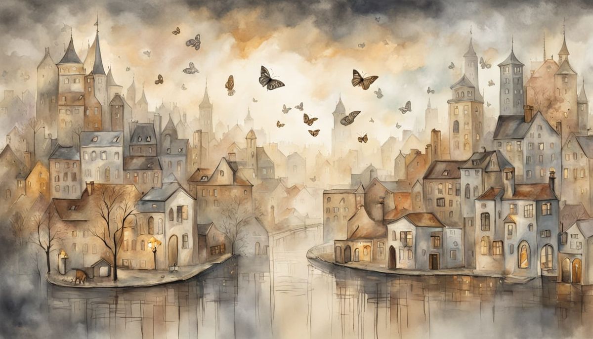 A pale watercolor painting of a striped kitty in a whimsical cityscape. Features soft brush strokes, muted neutrals, and a misty atmosphere, evoking a storybook fantasy.