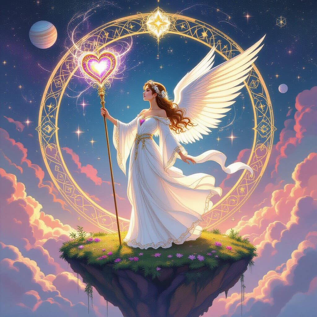 This image shows a celestial angel on a floating island. She holds a heart staff in a swirling galaxy filled with stars, planets and stardust. Magical energy crackles in the air, in an art nouveau style.