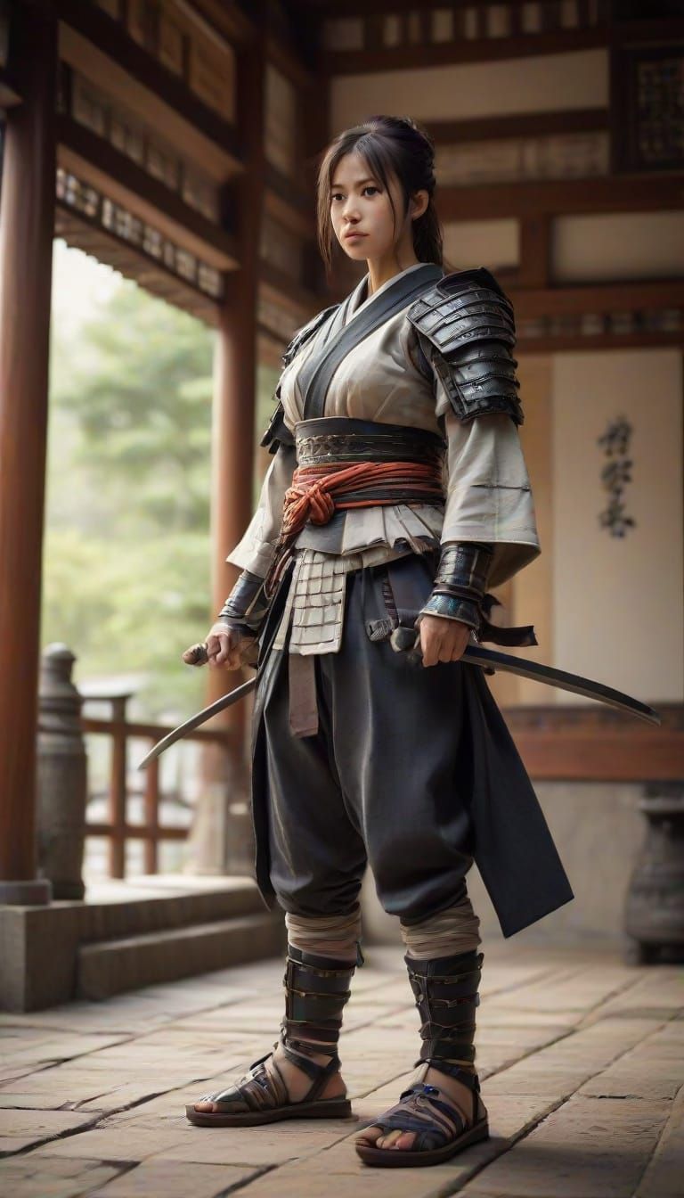 This image shows a powerful female warrior in a low-angle pose, set against a blurred backdrop of ancient Japanese architecture. The artwork blends dark fantasy and surreal elements, reminiscent of a particular style of Polish painter Wojciech Siudmak.