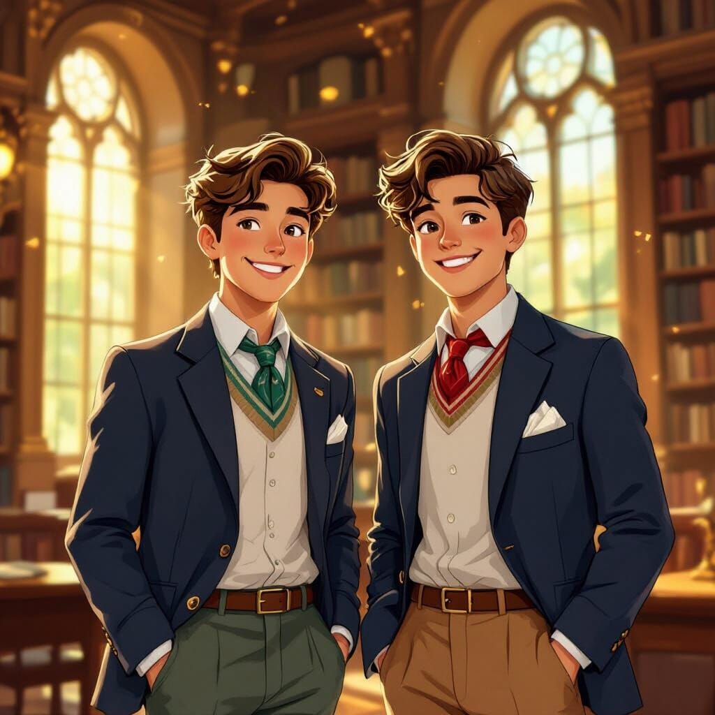 This image shows two smiling teenage boys in preppy attire within a sunlit college library. Rendered in a charming, illustrative style with vibrant colors and warm lighting, it evokes a nostalgic atmosphere.