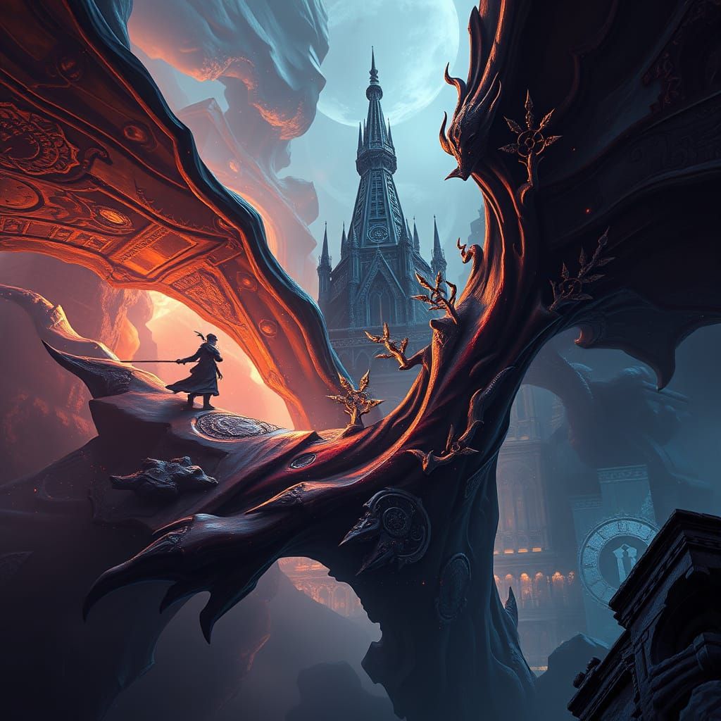 This image showcases a majestic, fantastical creature with a predominantly black base and intricate silver claws and fur details, set against a rich, detailed background, blending deep colors and complementary hues, reminiscent of fantasy concept art.