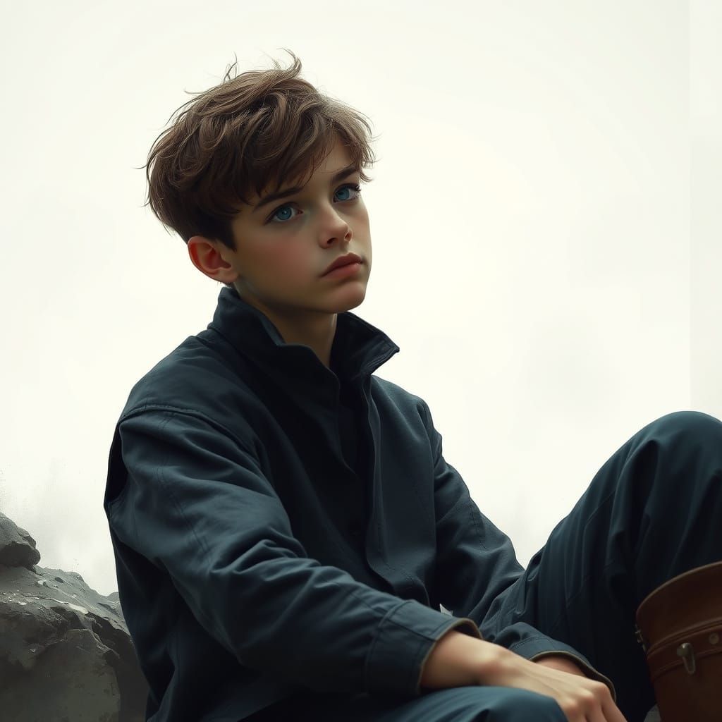 Ambrose is a 14-year-old boy with a mysterious and intelligent presence, often found quietly observing the world around him. With short, dark hair that falls just above sharp, thoughtful eyes—often a shade of deep blue or gray—Ambrose carries himself with calm confidence. His clothes are practical but refined, often wearing a dark tunic or cloak that hints at a noble or arcane background.