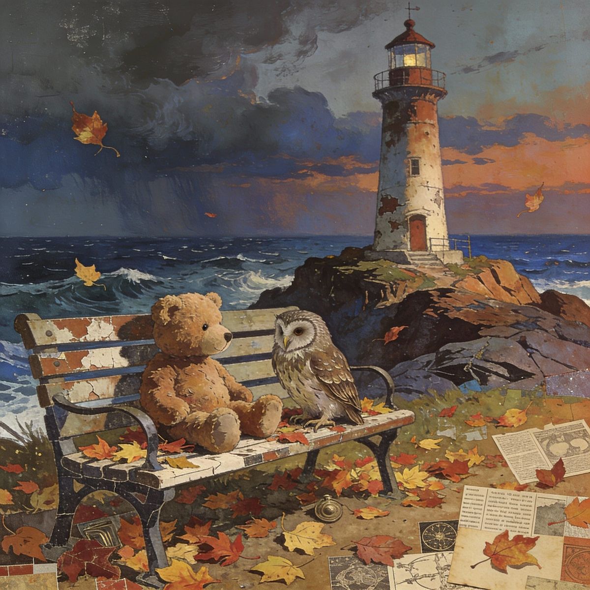This image depicts a child's forgotten teddy bear and a wise owl conversing on a park bench amidst scattered autumn leaves, rendered with painterly realism and whimsical illustration.