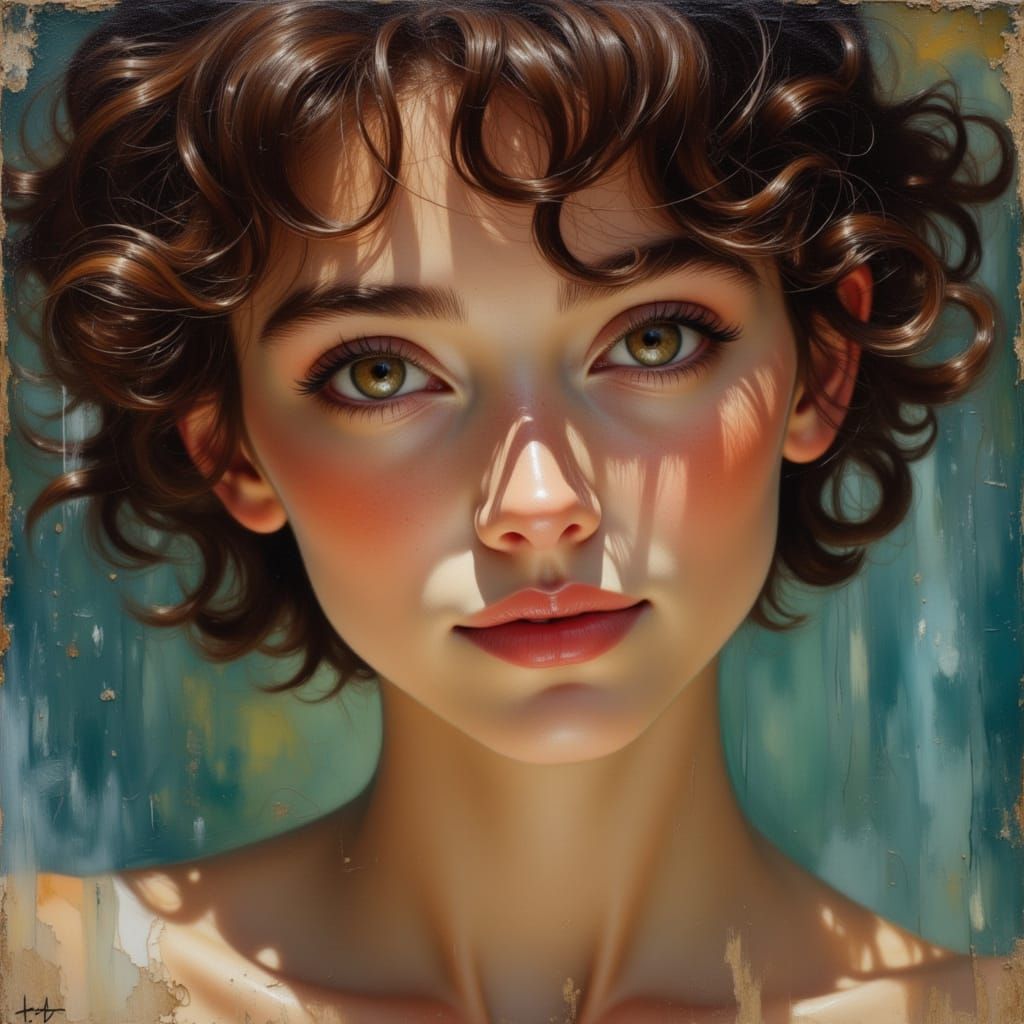<lora:Female Face:1.0> <lora:Brushed Oils:1.0> <lora:Atramento:1.0> <lora:Linen and Canvas:1.0> hyper realist close-up studio shot of youthful cute bubbly woman, brown eyes and short curly brown hair, gorgeous makeup, 3 point studio lighting, shimmering waterfall background