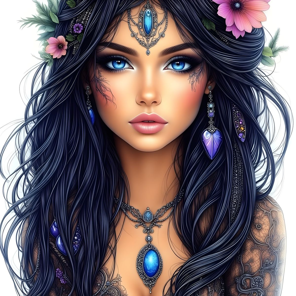 This image shows a hand-drawn portrait of a Norse goddess with flowing black hair and piercing blue eyes. She wears a jet pendant, rendered in a bohemian style.