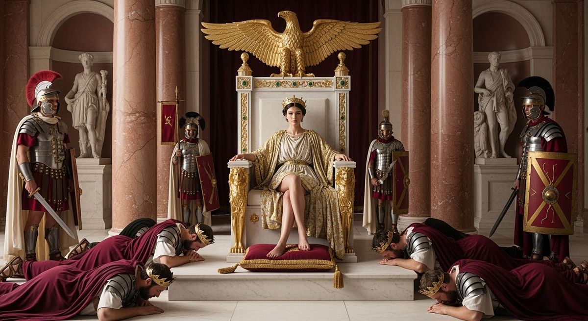 A striking picture of Empress Messalina on a giant throne. Defeated kings crawl at her feet as legionnaires stand guard. The image is captured with sharp focus and wide-angle lens in a hyperrealistic style.