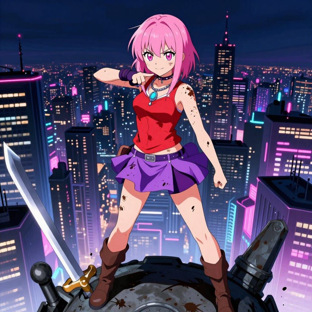 This image shows a defiant anime-style teen girl with pink hair and pink eyes, standing atop a sword with a city skyline at night. She has a small smile, suggesting victory after a fight.