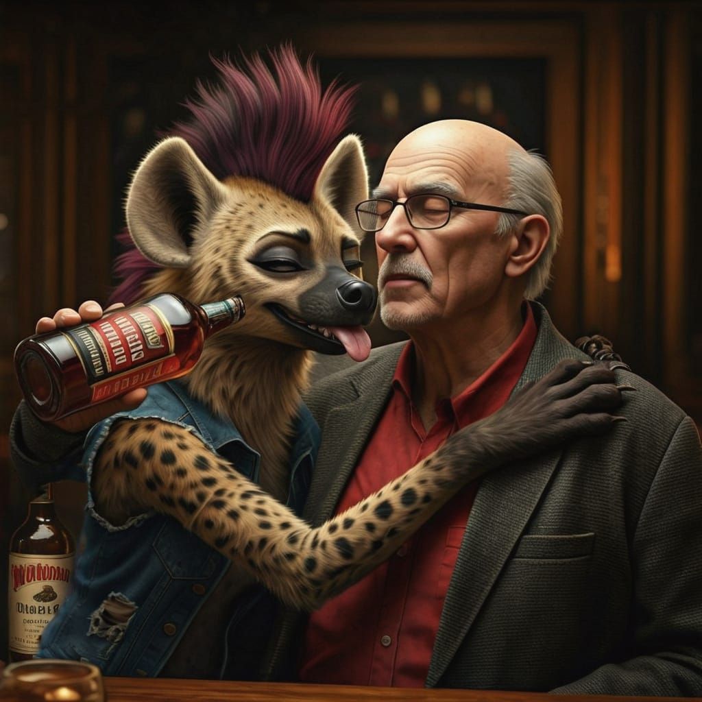 A close-up photo of an elderly bald man with glasses drinking whiskey in a dimly lit bar. The man looks old but is enjoying himself, depicted in a chiaroscuro style.