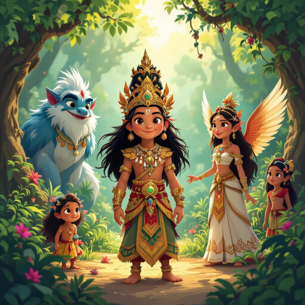 This image shows Aring Sinukwan, the young supreme god, in a vibrant forest clearing inspired by Filipino folklore. The warm, Disney Pixar-style illustration depicts him with mythical creatures in traditional attire.