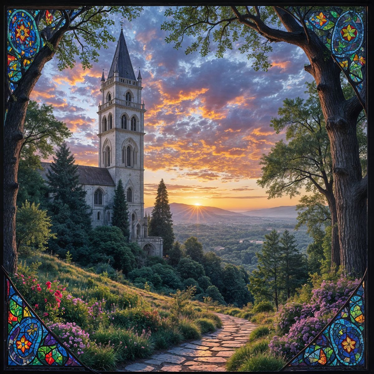 A stunning stained glass mosaic of a white stone tower rising above a vibrant green landscape at sunset. The artwork features deep, saturated colors and intricate details.