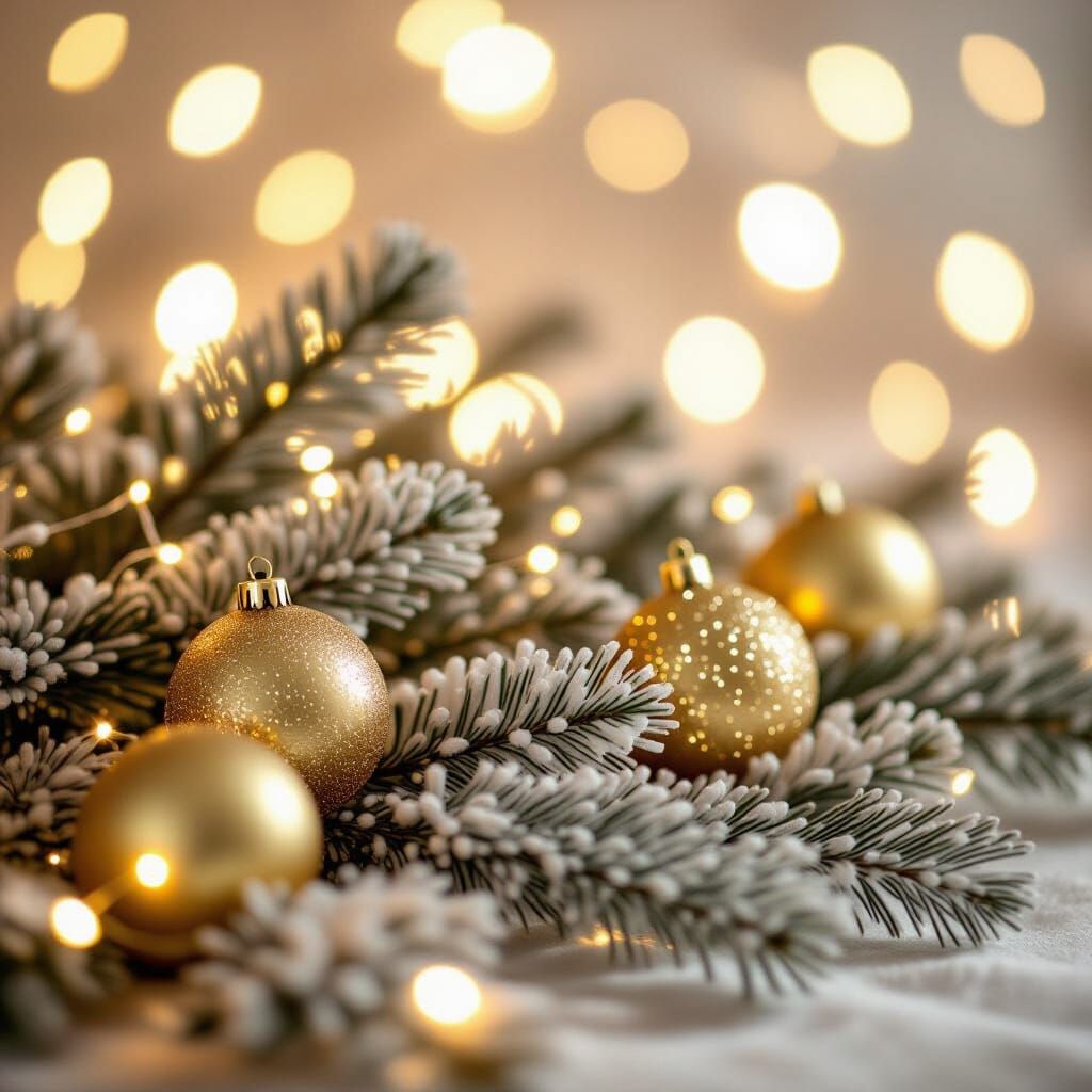 This image showcases minimalist Christmas decor in white and gold, with pine branches and soft bokeh lights, evoking a luxurious holiday feel. Photographed with a shallow depth of field and golden hour glow.