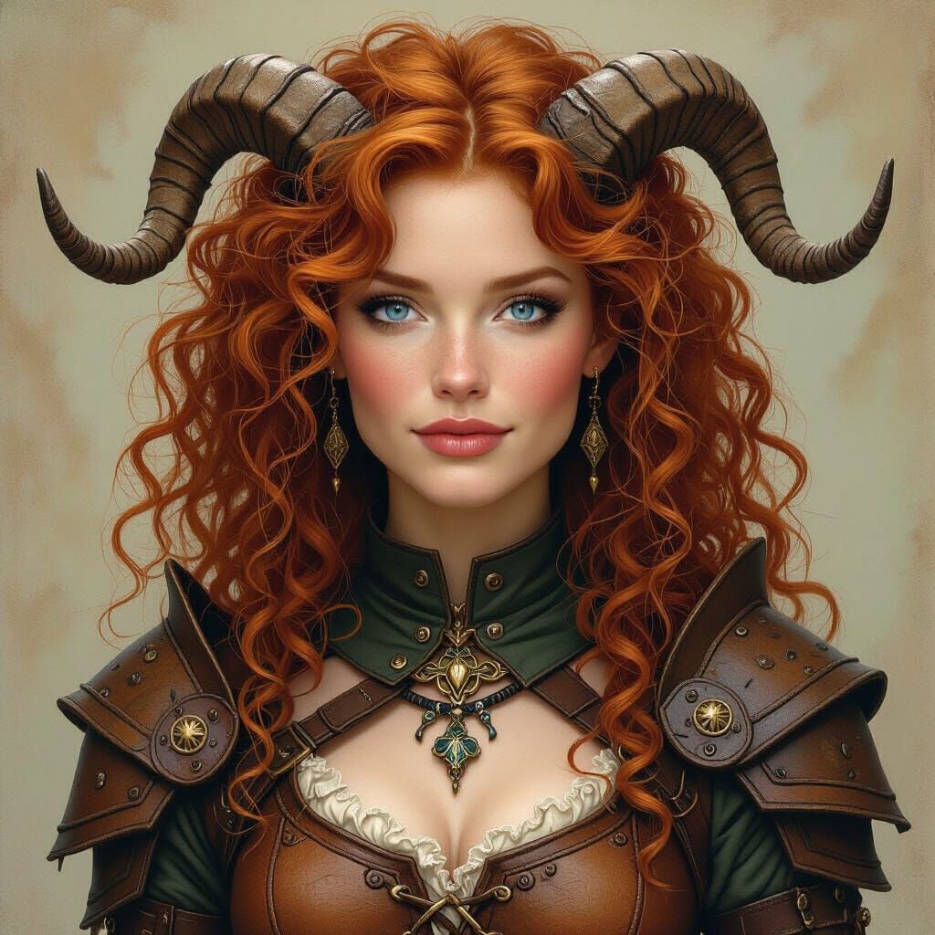 This image shows a woman with red hair and blue eyes wearing leather armor with horns. The artwork evokes fantasy art with intricate details and a mystical aesthetic.