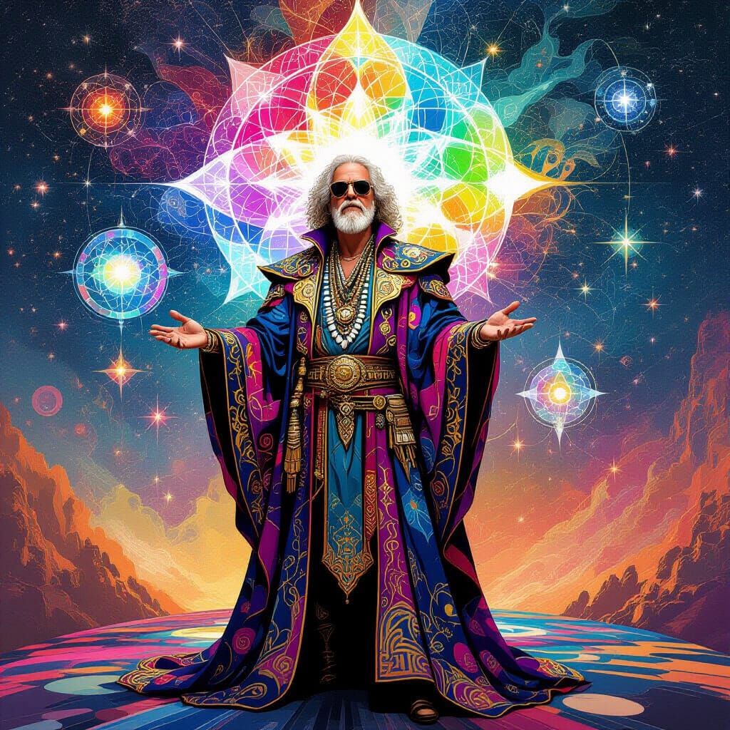 This image shows Michael Moorcock in a kaleidoscopic multiverse. He wears cosmic robes amidst astral projections, realized in a visionary mixed media style with bold lines and textures.