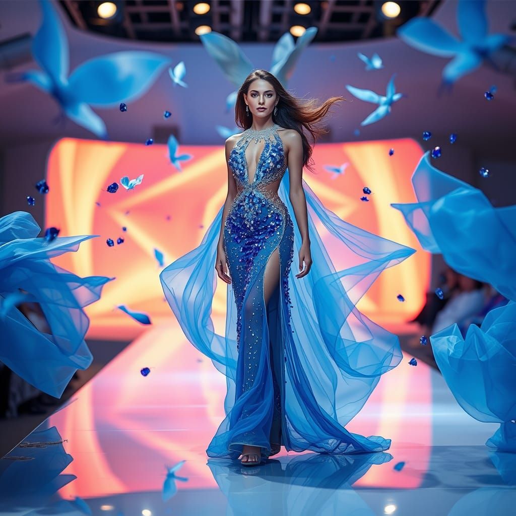 This image features a model posing in a glamorous, futuristic setting, surrounded by sparkling blue fabrics and hues of blue bubblegum, evoking a sense of whimsy and luxury.